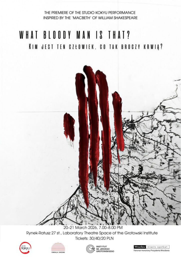 „Kim jest ten człowiek, co tak broczy krwią? / What bloody man is that?” — tytuł spektaklu Studia Kokyu inspirowanego dramatem Williama Szekspira — staje się pytaniem o współczesność: o logikę „WIĘCEJ / MORE”, która napędza ambicje przywódców, porusza masy, buduje imperia, a w konsekwencji popycha narody ku wojnie. W świecie, w którym decyzje polityczne uruchamiają realną przemoc, a propaganda i strach stają się narzędziami kontroli, Makbet brzmi jak ostrzeżenie — i jak diagnoza.